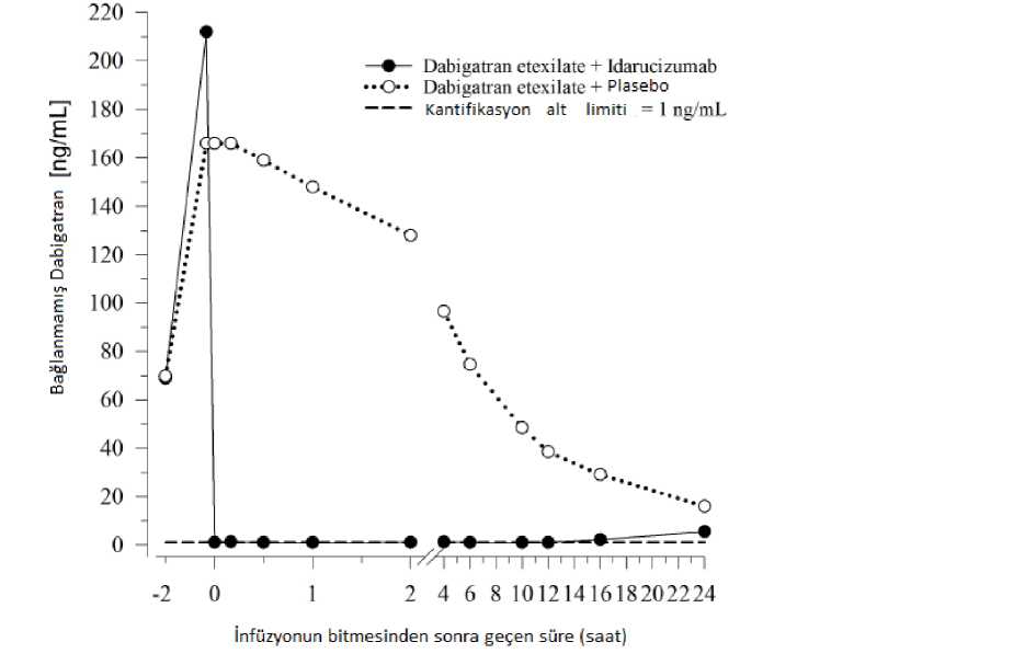 Şekil 4- Temsil edici özellikteki sağlıklı gönüllü grubunda bağlanmamış dabigatranın plazma düzeyleri (0.saatte idarucizumab veya plasebo uygulaması)